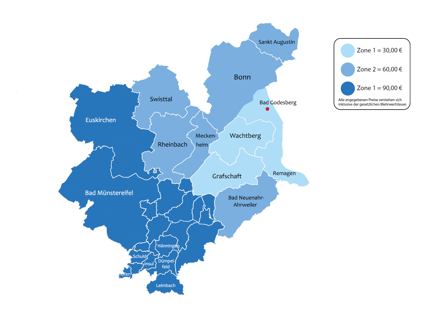 Die Kosten betragen pro 15 Minuten Arbeitseinheit 30,00 € inklusive Mehrwertsteuer die Anfahrt wird gemäß Ihres Ortsteils wie folgt berechnet: